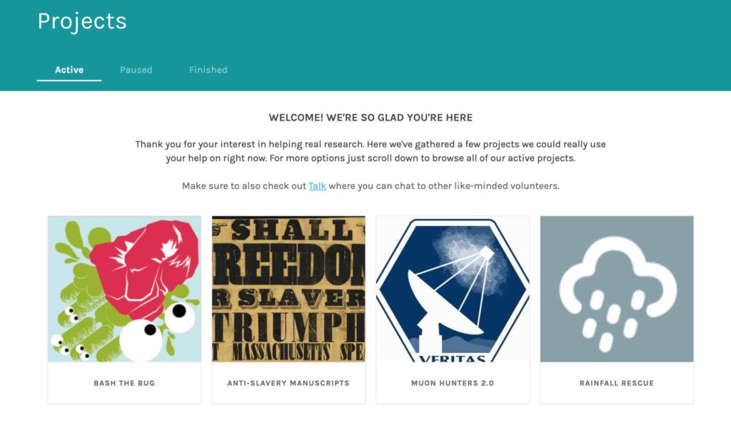 Citizen science projects including Galaxy Zoo (classifying galaxy pictures), Planet Hunters (searching for exoplanets), Solar StormWatch (tracking solar weather and effects on Earth) and numerous other astronomy ones. Additional citizen science projects in other disciplines like Arts, Literature, and Medicine.